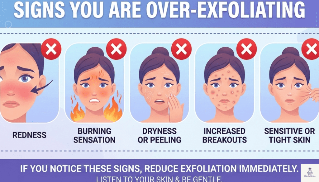 Over-exfoliation can strip the skin of natural oils, causing excessive dryness, flaking, or peeling.