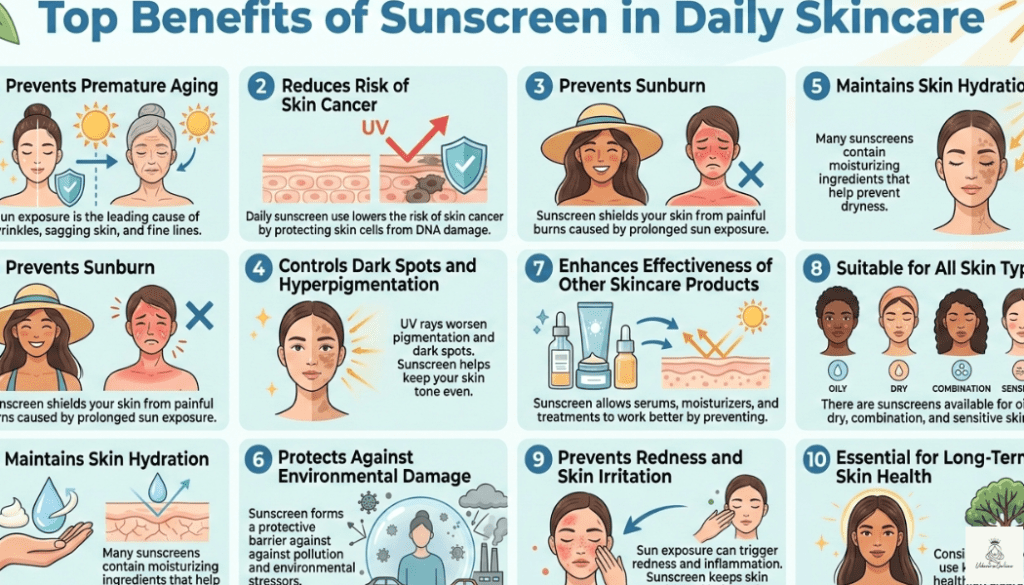The importance of sunscreen in daily skincare cannot be overstated. Sunscreen protects your skin from harmful UV rays, prevents premature aging, reduces pigmentation, and supports long-term skin health. Whether you stay indoors or go outside, daily sunscreen use is essential for maintaining youthful, healthy, and glowing skin.